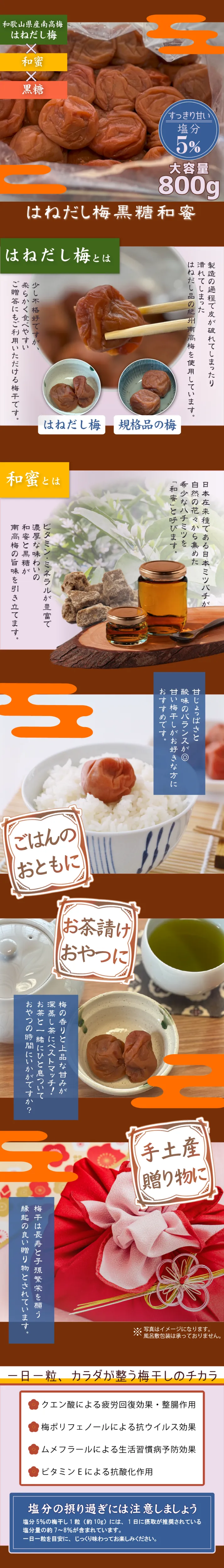 和歌山の梅と沖縄産の黒糖、和歌山産みかん蜂蜜、さらに国産の玄米黒酢で仕上げました。